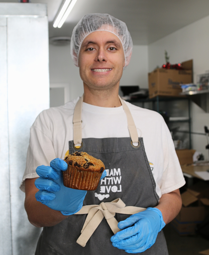 Behind the scenes at Mychal’s Bakery, Chris is building confidence, job skills, and independence one muffin at a time.