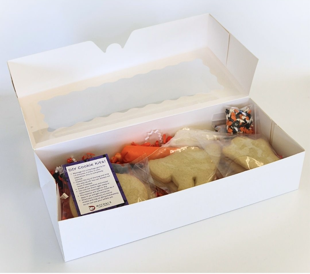 Get in the halloween spirit with this fun halloween cookie decorating kit including 5 sugar cookies, 3 different colored frostings and 2 sets of sprinkles.