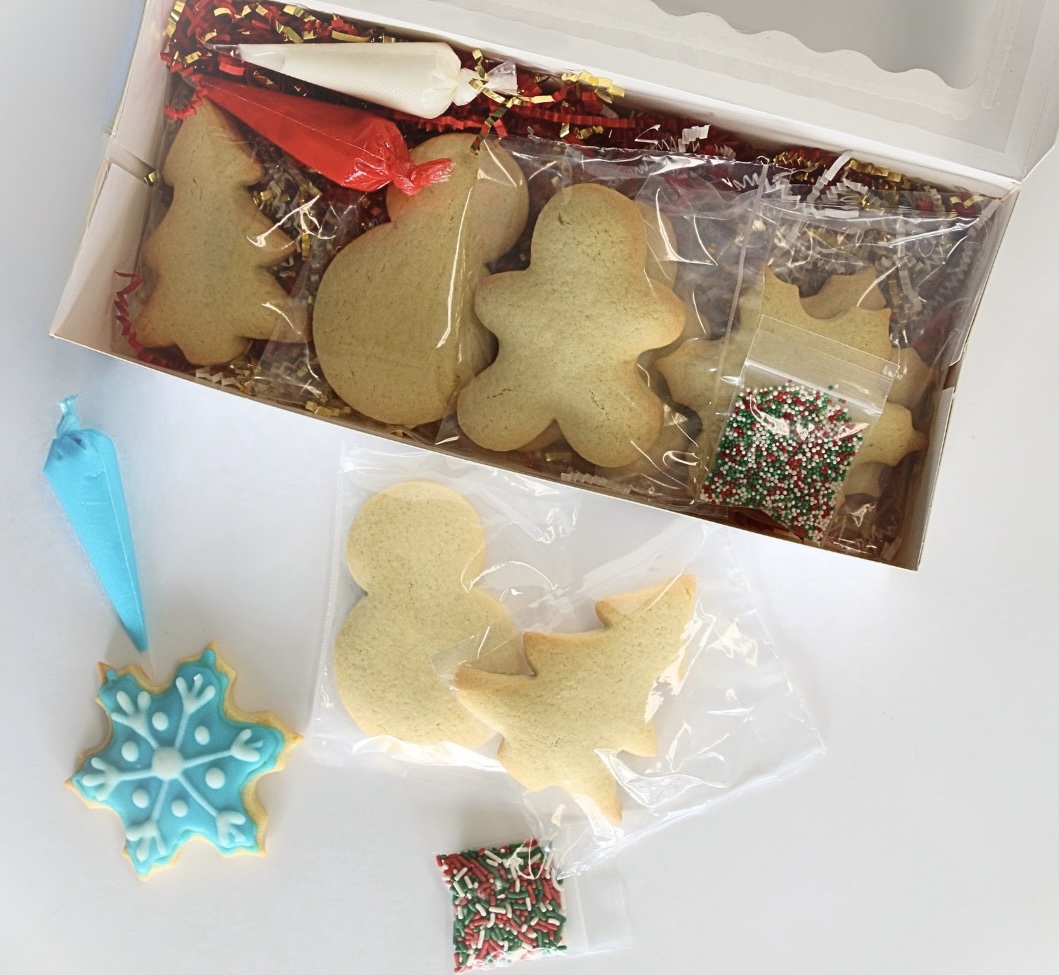 Get in the holiday spirit with this festive holiday cookie decorating kit including 5 sugar cookies, 3 different colored frostings and 2 sets of sprinkles.