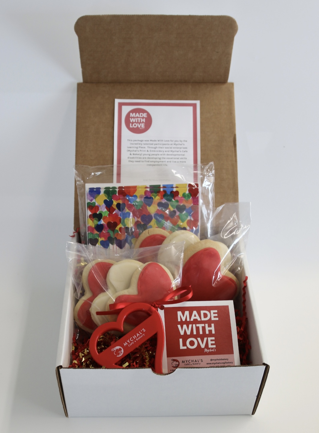 Our Mini Gift Box includes a heart-shaped cookie cutter, six beautifully decorated heart cookies, and an 8-pack of Made With Love cards. A sweet, thoughtful bundle perfect for gifting or celebrating someone special.